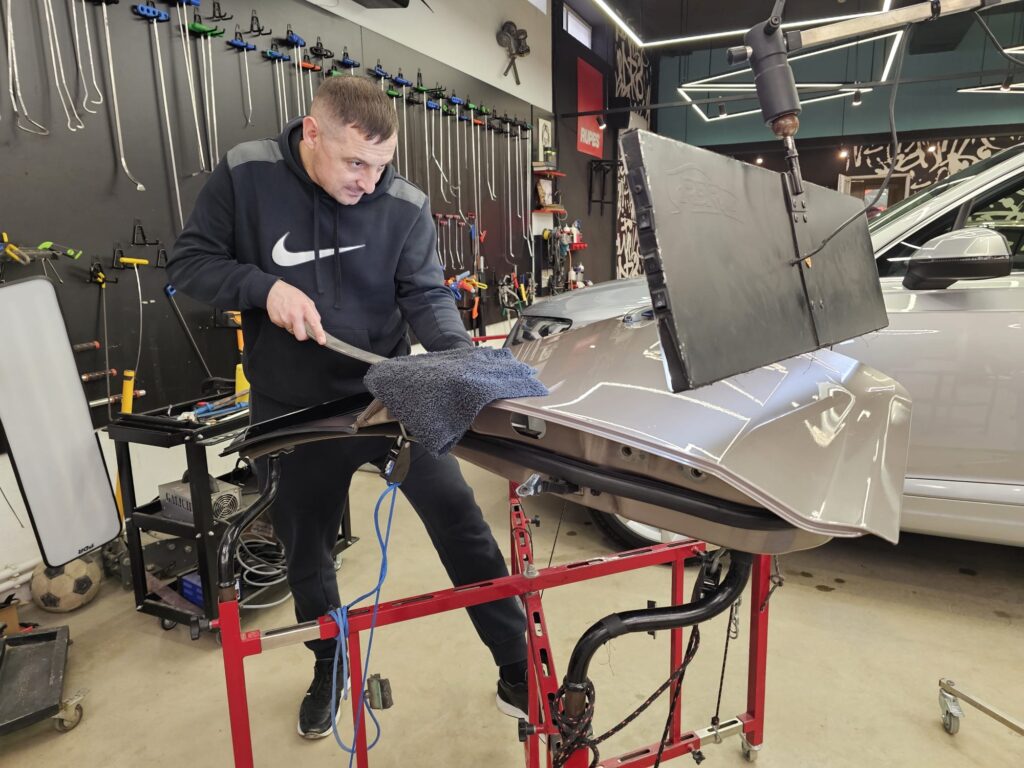 The panel is reshaped using PDR techniques to achieve the best possible finish before traditional bodywork and repainting.