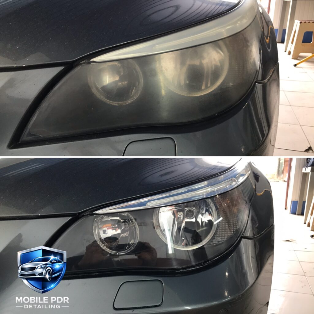 Exterior headlight polishing to remove yellowing, oxidised lacquer and restore clarity.